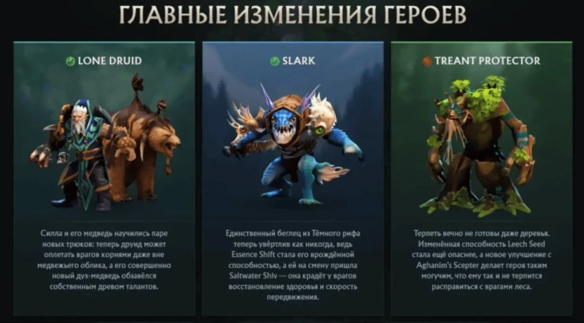 Также в патче 7.40 были изменены и другие герои. Lone Druid получил полностью обновленного медведя с собственными талантами, Slark стал мобильнее благодаря врожденной Essence Shift и новой способности Saltwater Shiv, а Treant Protector усилили за счет изменений Leech Seed и Aghanim’s Scepter.