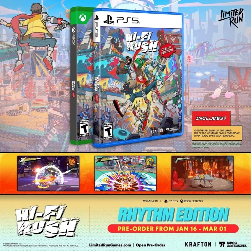 Обложка: промо-арт Hi-Fi RushLimited Run Games анонсировала аж три «физических» издания улётного ритм-экшена Hi-Fi Rush для PS5 и Xbox Series. Первое, Rhythm Edition, обойдётся в 40 долларов и будет включать в себя диск с игрой, а также DLC с костюмами: Bossplay, Traditional Garb, Templay.