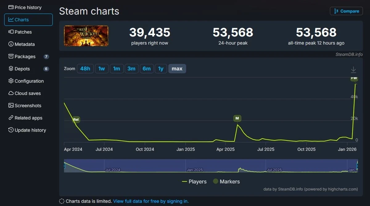 Обложка: промо-арт No Rest for the WickedРолевой экшен No Rest for the Wicked обновил рекорд по пиковому онлайну в Steam, который на момент публикации новости составляет 53 568 одновременных пользователей.