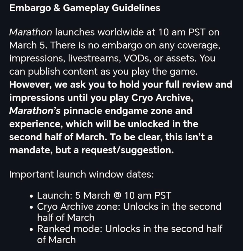 В нём Bungie просит делиться обзорами Marathon после того, как обзорщики опробуют Криоархив. Зону называют «вершиной эндгейм-игры», а выходит она во второй половине марта.